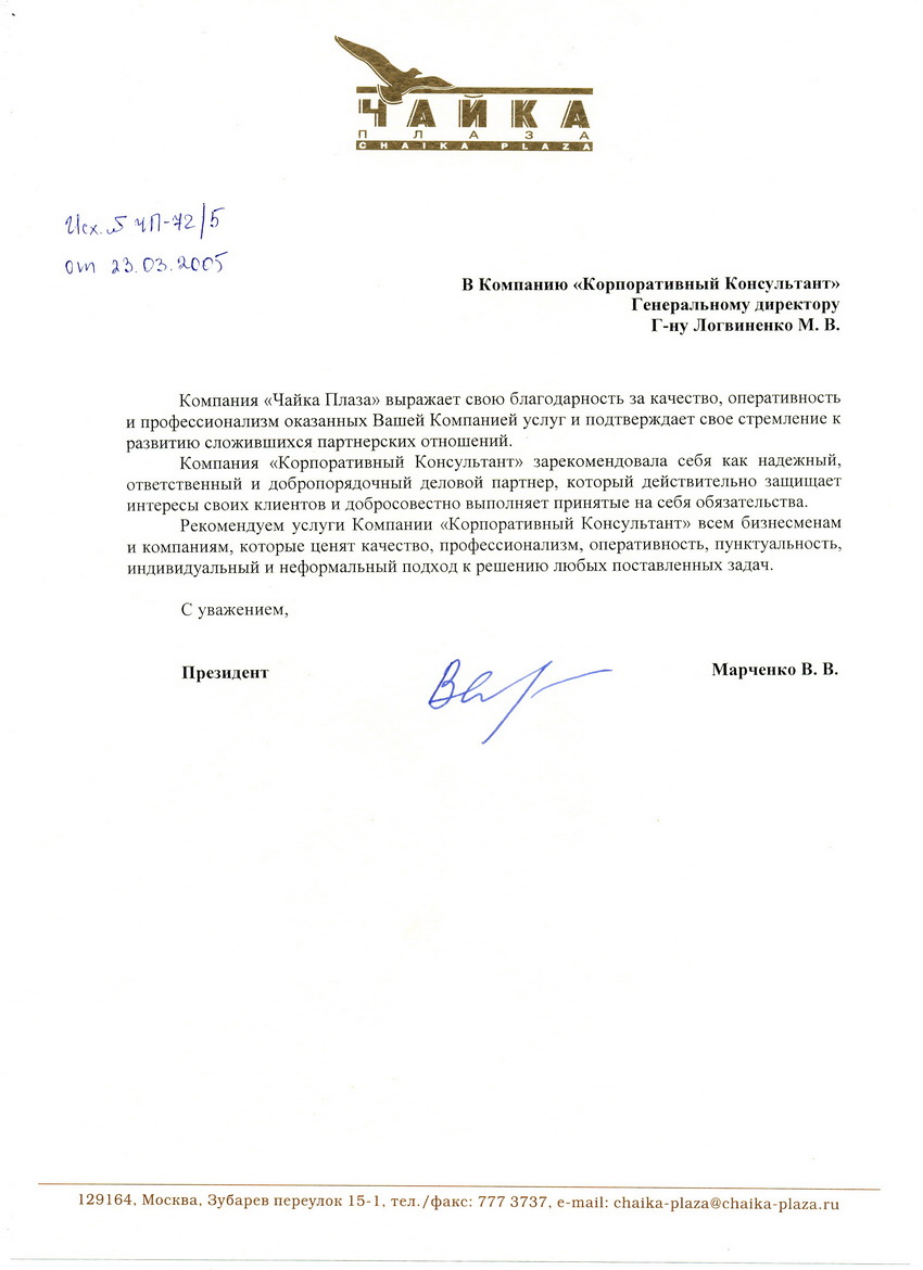 Компания «Чайка Плаза» выражает свою благодарность за качество, оперативность и профессионализм оказанных Вашей Компанией услуг и подтверждает свое стремление к развитию сложившихся партнерских отношений.