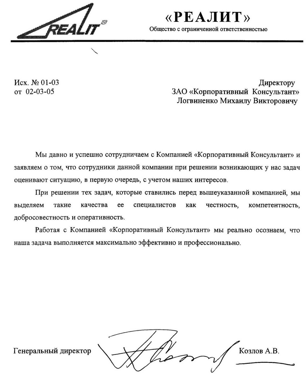РеалитМы давно и успешно сотрудничаем с Компанией «Корпоративный Консультант» и заявляем о том, что сотрудники данной компании при решении возникающих у нас задач оценивают ситуацию, в первую очередь, с учетом наших интересов.